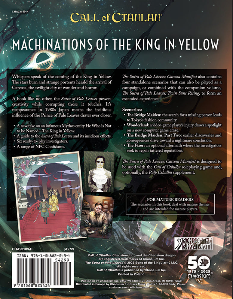Call of Cthulhu: The Sutra of Pale Leaves - Carcosa Manifest contains four scenarios for the unique setting of 1980s Japan. These scenarios can be played stand-alone, or strung together and combined with the scenarios from Twin Suns Rising to create a long-form campaign experience.
